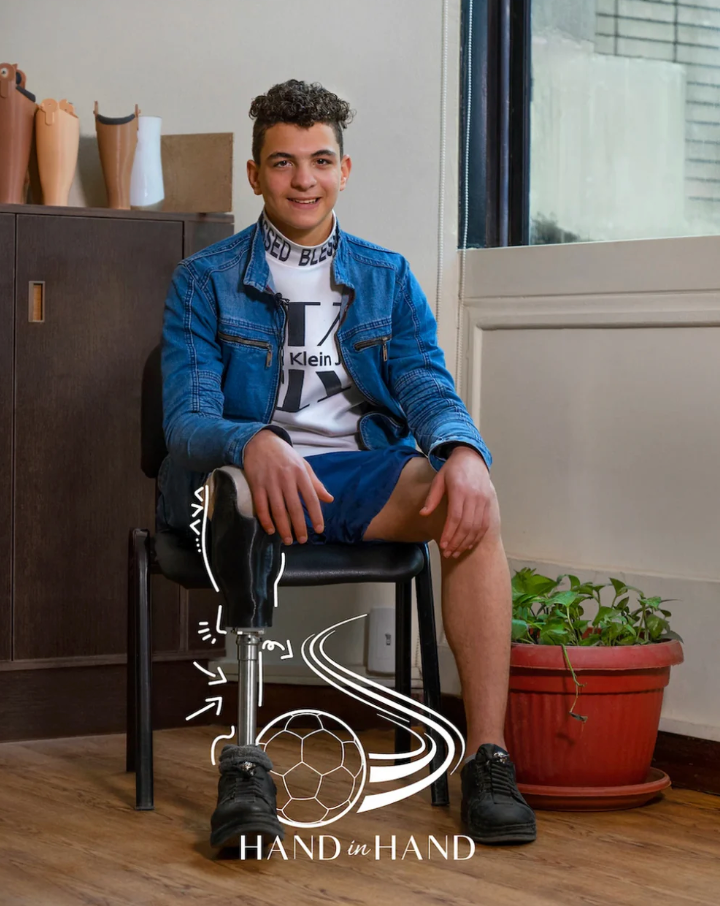 Moustafa, a 16-year-old passionate about football, faced a life-changing accident that led to the loss of his leg. He thought he’d never play again—until Hand in Hand provided him with a prosthetic leg. Now, he’s back on the field, doing what he loves most.